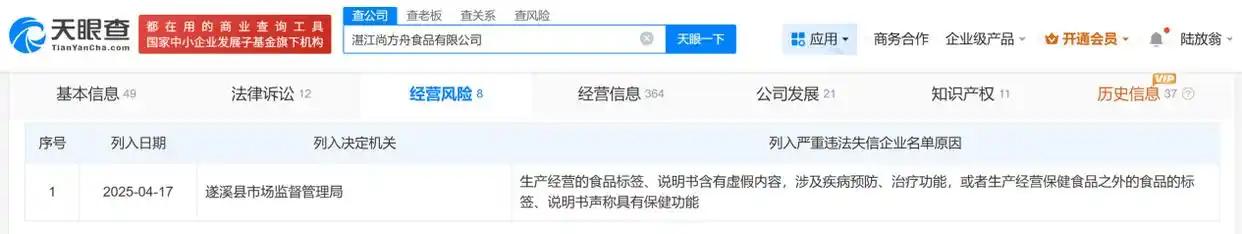 天眼查运营风险消息显示,该企业还因“出产运营的食物标签、仿单含有虚假内容,涉及疾病防止、医治功能,仿单声称具有保健功能”,于客岁4月17日被遂溪县市场监视办理局列入严沉违法失信企业名单。
